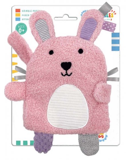 Ένα απαλό βιβλιαράκι σαν κουνελάκι, με διάφορες υφές για πλούσιο αισθητηριακό και διαδραστικό παιχνίδι! Οι σελίδες του με τα έντονα χρώματα τσαλακώνονται παράγοντας ήχους και ενισχύοντας την ακοή. Στο πλάι έχει πιαστράκι για να δένεται εύκολα στο καρότσι ή στην κούνια. Κλείσιμο με βέλκρο.