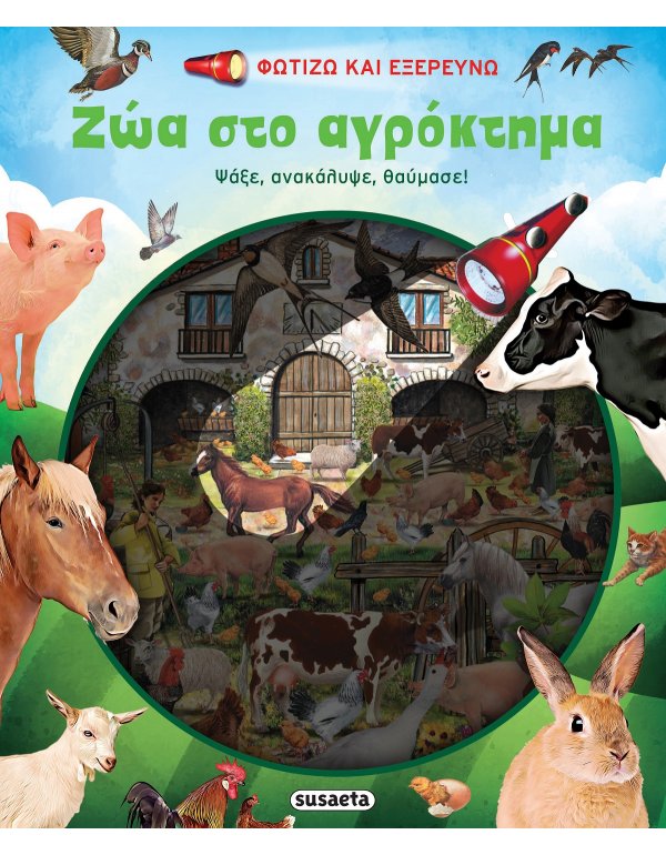 Φώτισε τα σκηνικά με τον φακό που θα βρεις στο βιβλίο και ανακάλυψε όλα τα ζώα του αγροκτήματος που κρύβονται στο σκοτάδι!