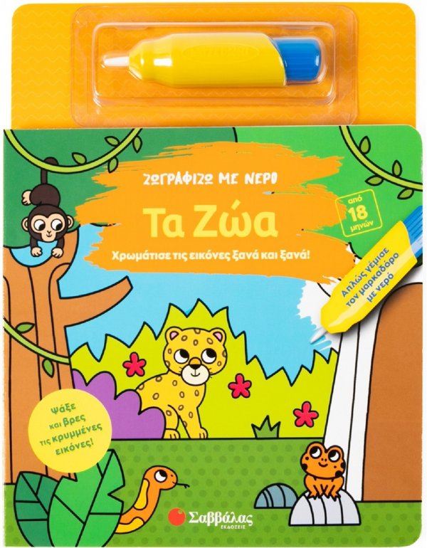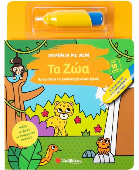Γέμισε τον μαρκαδόρο με νερό. Πέρασέ τον επάνω στις λευκές σελίδες και δες τα χρώματα να εμφανίζονται μαγικά! Ψάξε και βρες μέσα στην εικόνα όλα τα ζωάκια και τα αντικείμενα της αριστερής σελίδας. Όταν στεγνώσει το νερό, μπορείς να χρωματίσεις και πάλι τη σελίδα, ξανά και ξανά.