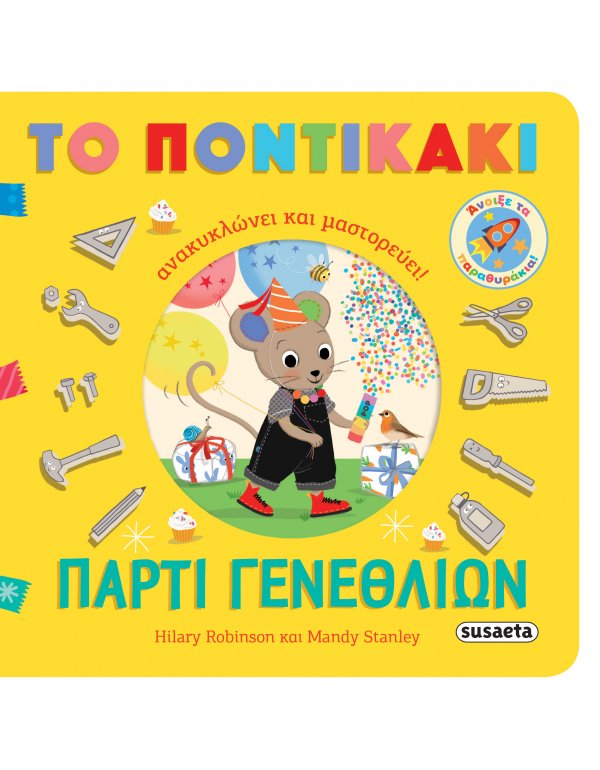 Το ποντικάκι αγαπάει το περιβάλλον και ξέρει να ανακυκλώνει με τον πιο έξυπνο τρόπο! Έχει πολλά εργαλεία, του αρέσουν οι κατασκευές και σκαρφίζεται τρόπους να επαναχρησιμοποιεί αντικείμενα που οι άλλοι θεωρούν άχρηστα. Βοήθησέ το να ετοιμάσει ένα πάρτι έκπληξη για τα γενέθλια του φίλου του σ’ αυτή τη διασκεδαστική ιστορία με παραθυράκια που κρύβουν… κι άλλες εκπλήξεις!