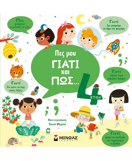 Ένα βιβλίο γνώσεων που δίνει απλές απαντήσεις στα «γιατί» και στα «πώς» των παιδιών ηλικίας 4 ετών. Με 130 εικονογραφημένες ερωταπαντήσεις για 5 σημαντικές θεματικές ενότητες: Το σώμα μου • Ζούμε μαζί • Ιστορία • Τα ζώα στον κόσμο • Πολιτισμός