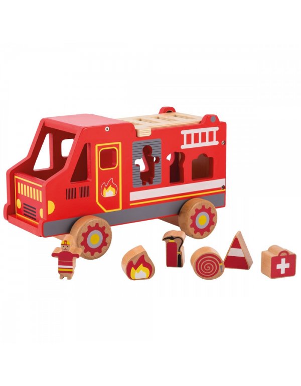 Ένα όχημα της πυροσβεστικής με υποδοχές για σχήματα για τους μικρούς μας διασώστες! Έντονα χρωματισμένο για να βοηθήσει τα παιδιά στην αναγνώριση χρωμάτων, σχημάτων, αλλά και αντικειμένων! Περιλαμβάνει 6 ξύλινα σχήματα, σε μεγάλο μέγεθος για μικρά χεράκια! Αναπτύσσει το συντονισμό των ματιών και των χεριών.