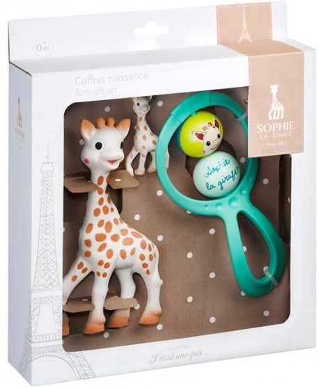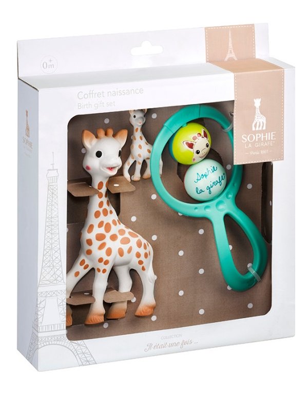 – Την Sophie la girafe, το πρώτο παιχνίδι του μωρού σε 100% φυσικό καουτσούκ για να διεγείρει όλες τις αισθήσεις.