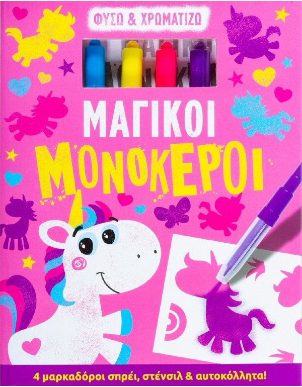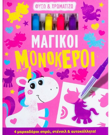 Διάβασε τις οδηγίες, παίξε τα παιχνίδια, κόλλησε τα αυτοκόλλητα, χρωμάτισε με τους μαρκαδόρους σπρέι και τα στένσιλ και ζωντάνεψε τους μονόκερους αυτού του βιβλίου ζωγραφικής!