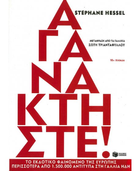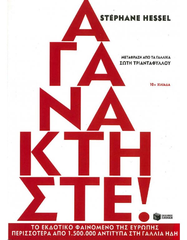 "Ενενήντα τριών ετών. Το τέλος δεν είναι μακριά. Αλλά τι τύχη, να μπορώ να υπενθυμίσω σε όλους μας αυτό που αποτέλεσε τη βάση της πολιτικής μου δράσης: το πρόγραμμα που εκπόνησε πριν από 67 χρόνια το Εθνικό Συμβούλιο της Αντίστασης!" γράφει ο αντιστασιακός Στεφάν Εσσέλ. Τι τύχη και για μας τους εκδότες, που έχουμε την ευκαιρία να τροφοδοτήσουμε τους αναγνώστες με την πείρα αυτού του ακούραστου αγωνιστή, που γλίτωσε από τα στρατόπεδα συγκέντρωσης του Μπούχενβαλντ και του Ντόρα Μίττελμπαου, αυτού του συντελεστή της Οικουμενικής Διακήρυξης των Δικαιωμάτων του Ανθρώπου το 1948, που υπήρξε πρέσβης της Γαλλίας και που ανακηρύχθηκε αξιωματούχος της Λεγεώνας της Τιμής! Για τον Στεφάν Εσσέλ, το "βασικό κίνητρο της Αντίστασης ήταν η αγανάκτηση". Σίγουρα οι αιτίες που προκαλούν αγανάκτηση στον περίπλοκο σημερινό κόσμο φαίνονται λιγότερο σαφείς από ό,τι τον καιρό του ναζισμού. Αλλά "όποιος ψάχνει βρίσκει": η όλο και μεγαλύτερη διαφορά μεταξύ πλουσίων και φτωχών, η περιβαλλοντική κρίση του πλανήτη, η κακομεταχείριση των λαθρομεταναστών αλλά και των νόμιμων μεταναστών και των τσιγγάνων. Ακόμα, η κούρσα του "όλο και περισσότερο", ο ανταγωνισμός, η δικτατορία των χρηματαγορών, η επίθεση στα δικαιώματα που εξασφάλισε η Αντίσταση, συντάξεις, κοινωνική ασφάλιση κ.ά. Όμως, για να είμαστε αποτελεσματικοί, πρέπει, όπως παλιά, να δικτυωθούμε και να δράσουμε συλλογικά. Ας ακούσουμε λοιπόν τον Στεφάν Εσσέλ, που μας καλεί σε μια "ειρηνική εξέγερση".