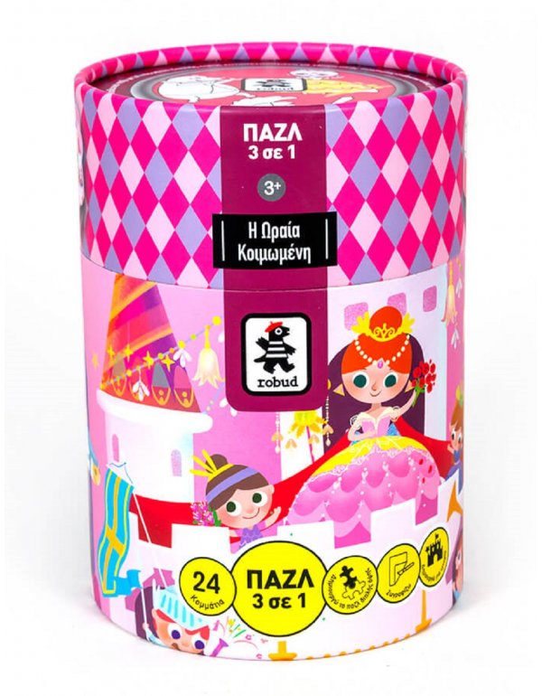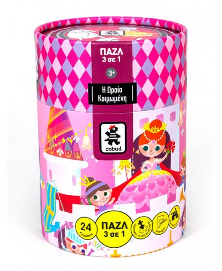 Το απόλυτο κουτί δραστηριοτήτων με θέμα την Ωραία Κοιμωμένη, ένα αγαπημένο κλασικό παραμύθι για μια όμορφη πριγκίπισσα, ένα υπνωτικό ξόρκι και έναν όμορφο πρίγκιπα. Ένα πρωτότυπο εκπαιδευτικό παζλ 24 κομματιών διπλής όψης σε συνδυασμό με εκπαιδευτικές δραστηριότητες! Τα μικρά παιδιά αφού ενώσουν τα κομμάτια και δημιουργήσουν την εικόνα μπορούν να χρωματίσουν την πίσω όψη του παζλ, καλλιεργώντας με τον τρόπο αυτό τη δημιουργικότητα και τις καλλιτεχνικές τους δεξιότητες. Η διασκέδαση όμως δε σταματά εκεί. Χρησιμοποίησε τη φαντασία σου και με τις εικόνες που βλέπεις, δημιούργησε τη δική σου ιστορία που μπορεί να έχει πολλές ανατροπές και εκπλήξεις σε σχέση με το παραμύθι!