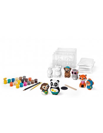 Κουτί παιχνιδιών με γύψο που περιέχει: 4 καλούπια (8 ειδώλια: σκίουρος, αλεπού, σκύλος, γάτα, μαϊμού, πάντα, κουνέλι, αρκούδα), 4 φακελάκια γύψο (1,2 κιλά), 18 γλάστρες με χρώμα, 1 μαύρο μολύβι, 1 πινέλο, 1 ξύλινη σπάτουλα και 1 ελαφρόπετρα.