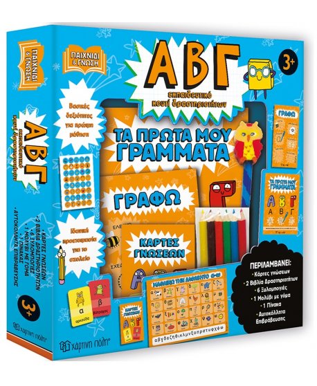 Ένα εκπαιδευτικό κουτί που περιλαμβάνει: 2 βιβλία δραστηριοτήτων, 1 πίνακα, αυτοκόλλητα επιβράβευσης και έξυπνες κάρτες, ειδικά σχεδιασμένα για να βοηθούν το παιδί να μάθει να διαβάζει και να γράφει το αλφάβητο, αλλά και μικρές λέξεις, με τρόπο διασκεδαστικό.