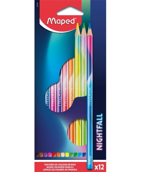 Συσκευασία με 12 χρωματιστά μολύβια Nightfall κατασκευασμένα από ποιοτικό ξύλο για να σας συνοδεύουν σε όλες τις καλλιτεχνικές σας πρακτικές. Τα φωτεινά και έντονα χρώματα τους θα αρέσουν σε κάθε μαθητή. Το μαλακό, γενναιόδωρο και ανθεκτικό μόλυβδο 2,9 mm γλιστρά πάνω από το χαρτί για άνεση. Διακοσμημένο με όμορφα μεταλλικά χρώματα με βαμμένη μύτη κάνοντας εύκολη την επιλογή χρώματος. Το εργονομικό τριγωνικό σχήμα τους διευκολύνει στο χειρισμό και εξασφαλίζει βέλτιστο κράτημα.
