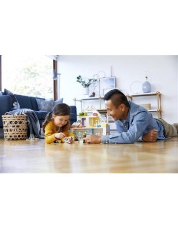 Αυτό το ανοιχτό και προσβάσιμο κουκλόσπιτο είναι ιδανικό για να παίζετε μαζί. Μάθετε στα νήπια την καθημερινή ζωή, όπως το μαγείρεμα, την ώρα του φαγητού και τη ρουτίνα πριν τον ύπνο. Γεμάτο οικείες λεπτομέρειες, καθώς επίσης και με φιγούρες μαμάς, μπαμπά και παιδιού και ένα κατοικίδιο σκύλο και αρκουδάκι-παιχνίδι, θα σας βοηθήσει να μοιραστείτε πολλές μαγικές στιγμές με το παιδί σας. Για ακόμα περισσότερη διασκέδαση, ανακατασκευάστε το κύριο σπίτι σε πύργο και, στη συνέχεια, ξανά σε κατοικία!