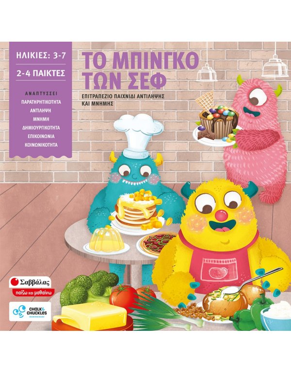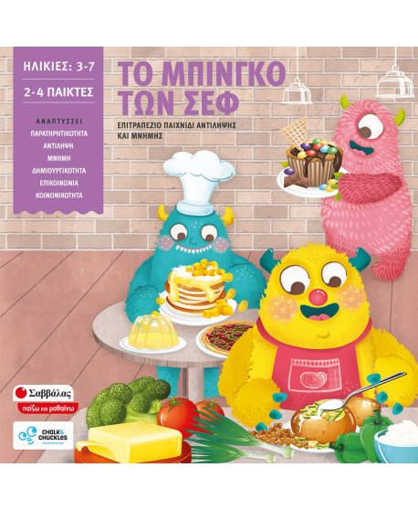 Περιέχει: 4 κάρτες φαγητών, 16 πλακίδια με πιάτα, 64 πλακίδια με υλικά, 1 υφασμάτινη σακούλα, 1 μαρκαδόρο που σβήνει, οδηγίες.