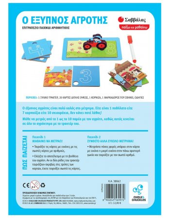 Μάθε να μετράς από το 1 ως το 10 παρέα με τον αγρότη, καθώς αυτός κινείται σε όλο το αγρόκτημα με το τρακτέρ του. Ταίριαξε τις εικόνες με τους αριθμούς και έλεγξε το αποτέλεσμα με τη βοήθεια του αγρότη! Αν οι δύο ρόδες του τρακτέρ ταιριάζουν ακριβώς στις τρύπες των καρτών, έχεις ταιριάξει σωστά τις κάρτες!Περιέχει: 1 ξύλινο τρακτέρ, 20 κάρτες διπλής όψης, 1 κορνίζα, 1 μαρκαδόρο που σβήνει, οδηγίες.Αναπτύσσει: • Αριθμητικές δεξιότητες • Αντίληψη χώρου • Παρατηρητικότητα • Λεπτή κινητικότητα • Προγραφή.