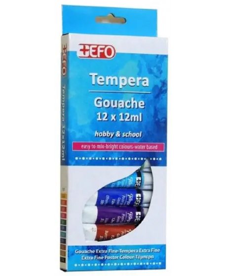 Σετ Τέμπερες με 12 βασικές αποχρώσεις των 12 ml, χρώματα νερού κατάλληλες για χαρτί, ξύλο, χαρτόνι.