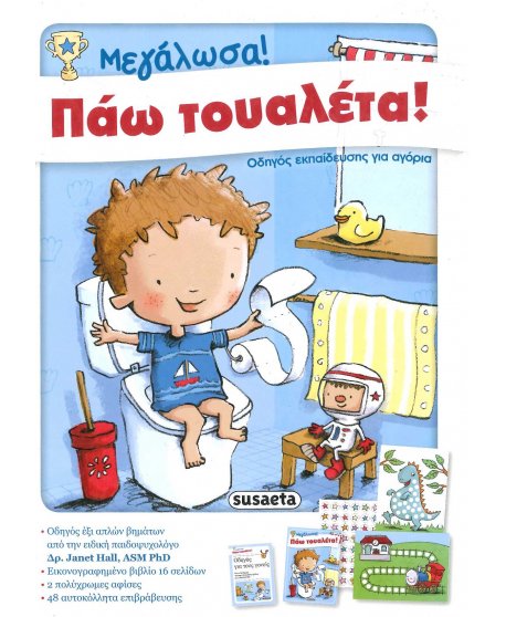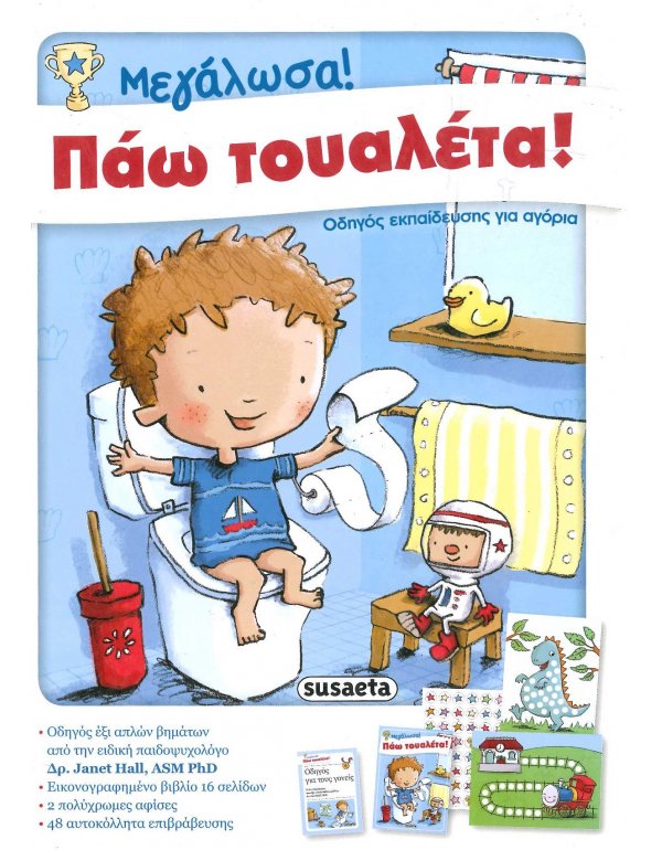 Ένας εύχρηστος οδηγός για τους γονείς που θέλουν να εκπαιδεύσουν τα παιδιά τους στην αγωγή τουαλέτας. Περιλαμβάνει ένα 16σέλιδο βιβλίο με χρήσιμες συμβουλές και οδηγίες, ένα χαρτονέ βιβλίο για τα παιδιά, καθώς και 2 αφίσες και αυτοκόλλητα επιβράβευσης.