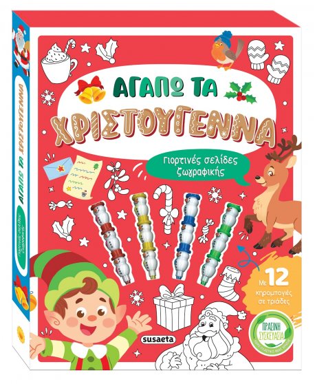 Σε αυτό το υπέροχο κουτί θα βρεις ένα μπλοκ ζωγραφικής με 32 γιορτινές εικόνες, για να τις ζωντανέψεις με τα χρώματα που θέλεις και να νιώσεις τη μαγεία και τη χαρά των Χριστουγέννων! Χάρη στις 12 κηρομπογιές, που έχουν σχήμα χιονάνθρωπου και μπαίνουν εύκολα η μία πάνω από την άλλη, θα δημιουργήσεις απίθανες σκηνές με πρωταγωνιστές τον Αϊ-Βασίλη, τους ταράνδους του, τα ξωτικά και τους φίλους τους. Θα τους βρεις ανάμεσα σε εντυπωσιακά δώρα, λαμπερά χριστουγεννιάτικα στολίδια, λαχταριστά γλυκίσματα και πολλές πολλές εκπλήξεις!